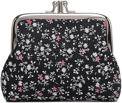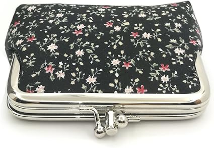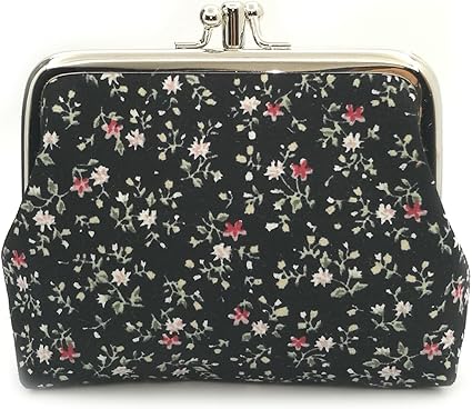 This vintage floral coin purse features a black background with delicate white and pink floral prints, paired with a classic metal kiss lock. Compact yet practical, it easily stores coins, folded bills, keys, jewelry, earbuds, or lipsticks, keeping your essentials neat and stylish.